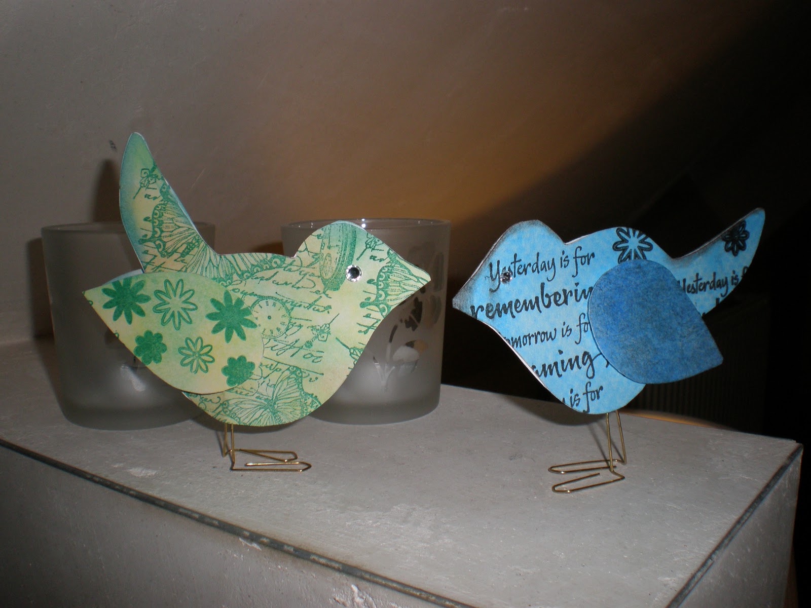 De eerste twee die ik gemaakt heb waren uit Vintage papier. Aangezien ze niet perfect uitgeknipt en geplakt zijn heb ik het idee van Andrea met de houtskool- & potloodrandjes overgenomen. Alleen heb ik de randen niet met potlood en houtskool, maar natuurlijk met de Te Gekke Krijtjes bewerkt. Valt de imperfectie niet zo op :). Vind ze best wel geslaagd. Enkel de geplooide paperclippenpootjes vastmaken en zo modelleren dat de mussen blijven staan is even engelengeduld uitoefenen. Maar ...hoe meer je er maakt, hoe makkelijker ook dat wordt. Pfff.